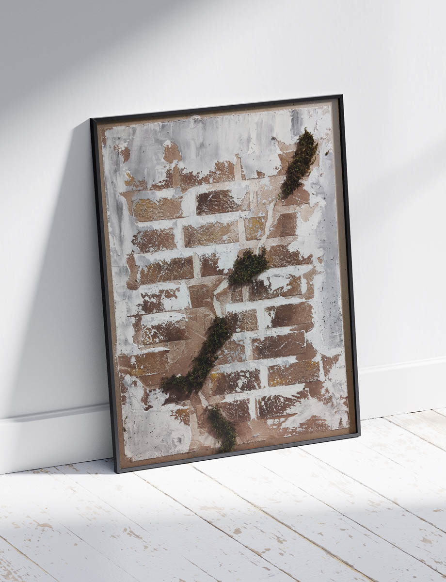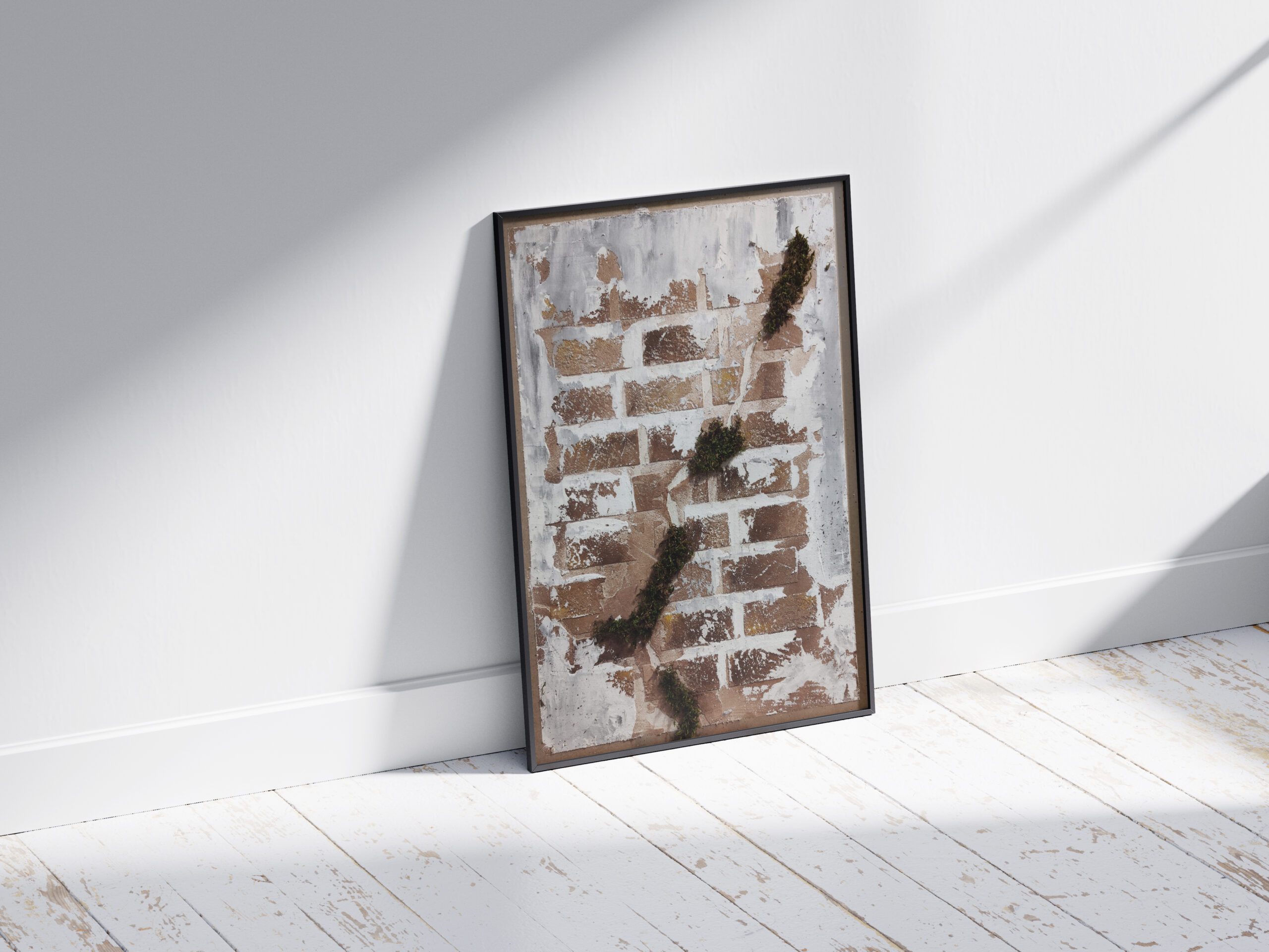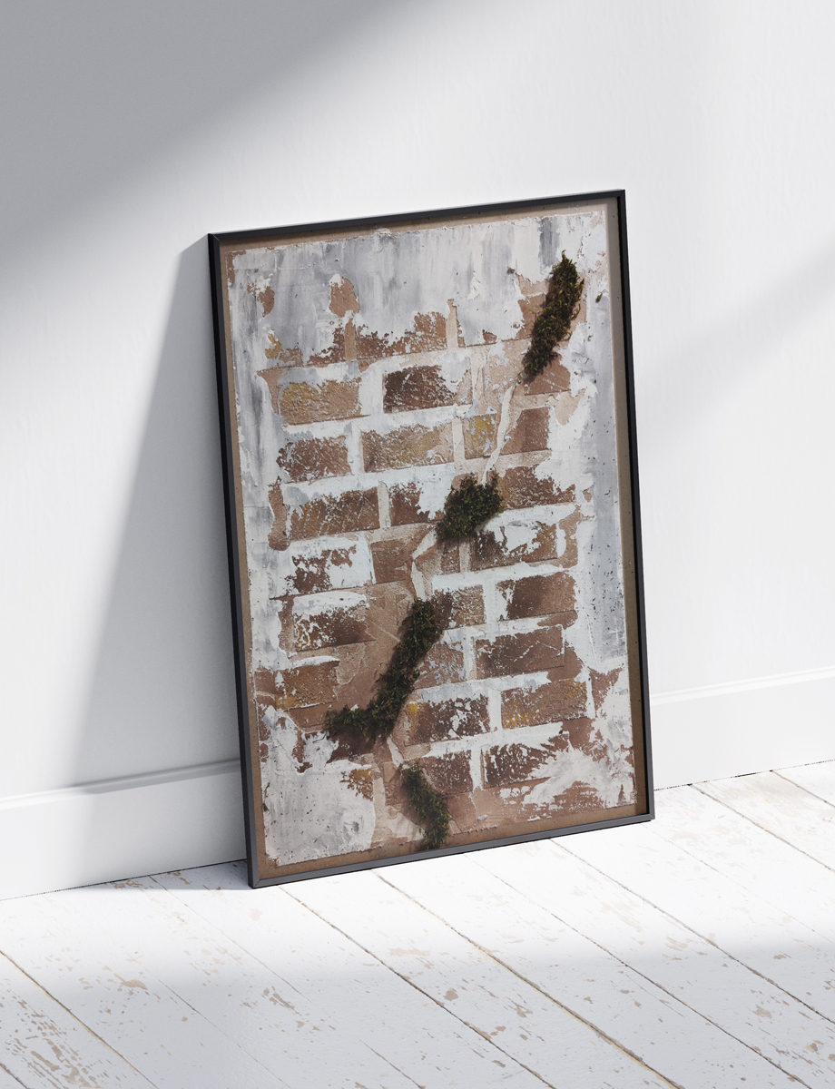 Whispers of Time beautifully captures the rustic charm of aged brickwork fused with natural elements. The weathered surface, adorned with carefully placed moss, tells a story of resilience and renewal, where nature gracefully reclaims its place amidst man-made structures. The textured white and earthy tones, paired with cracks and imperfections, exude raw elegance and authenticity. Encased in a minimalist black frame, this artwork is ideal for industrial, modern, or loft-style interiors, adding depth and character to any space. It’s a testament to the harmony between decay and rebirth.
